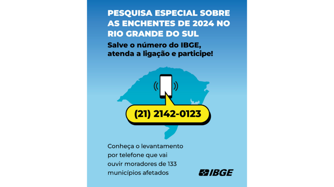O Instituto Brasileiro de Geografia e Estatística (IBGE) iniciou, no dia 15 de setembro, a fase de coleta da Pesquisa Especial sobre as Enchentes de 2024 no Rio Grande do Sul. As entrevistas acontecem exclusivamente por telefone, por meio do número (21) 2142-0123, até o dia 19 de dezembro.